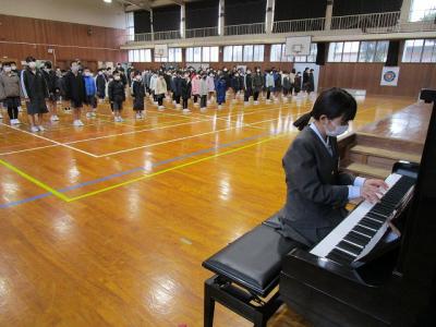 6年生の素敵な伴奏に合わせて,「7つの島の向こうから~♪」と校歌を歌い,校長先生のお話をお聞きしました。