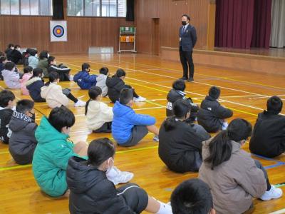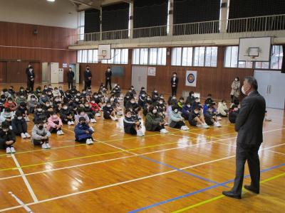 3学期の学校生活について何を大切にしてほしいかを生徒指導担当の先生が,鳳至の子に伝えました。鳳至小が1年間を通して大切にしている「生活のきまり」を確認する場面もありました。