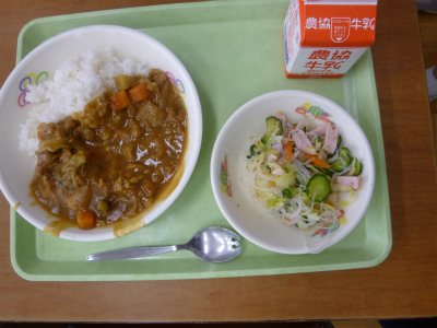 今日の献立は、 カレーライス マカロニサラダ かぼちゃのデザート 牛乳です。