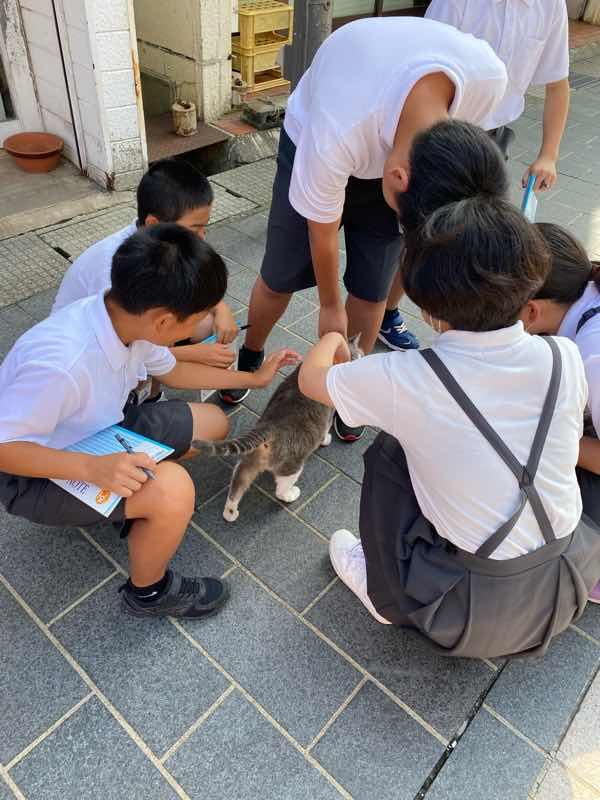 (写真は朝市の名物猫ちゃんと戯れる6年生です。)