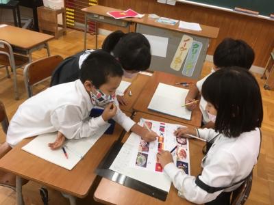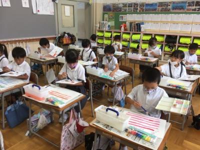 図工の時間に楽しみにしていた絵の具を使って色を塗りました。