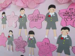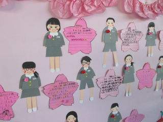 卒業生より一足早く胸に花が飾られました。明日の卒業式は花を付けた似顔絵たちが卒業生を出迎えます。いよいよ卒業です!