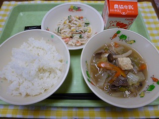 ごはん、すき焼き風煮、大根サラダ、ひじきのり、牛乳です。