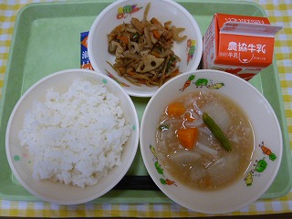ごはん、大根のそぼろ煮、五目きんぴら、ふりかけ、牛乳です。