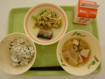 わかめごはん さんまのかぼすレモン煮 おひたし のっぺい汁 牛乳 です。