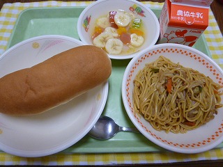 コッペパン、焼きそば、フルーツカクテル、牛乳です。