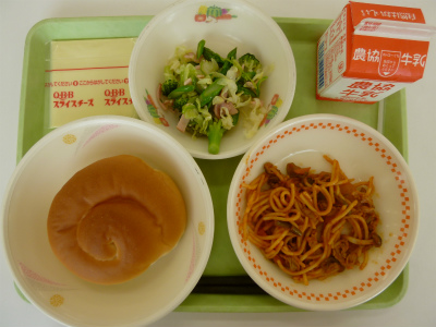 ミルクロール、スパゲティーソテー、グリーンサラダ、スライスチーズ、牛乳です。