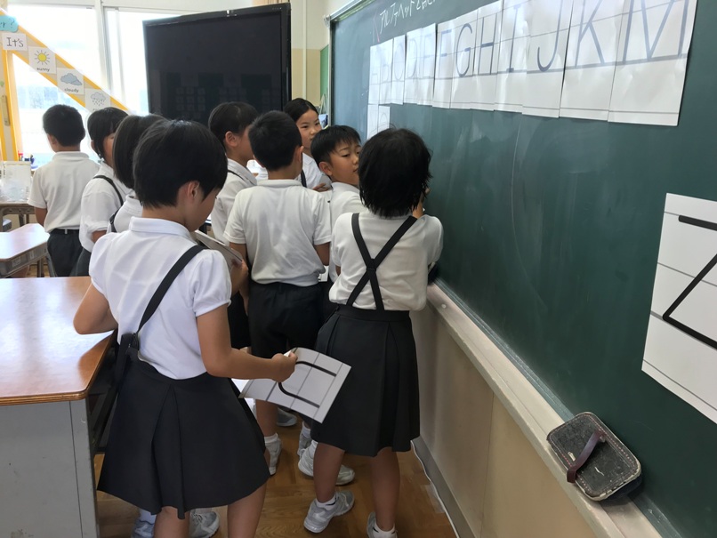 3年生の学習でもアルファベットの学習に入りました。前回の学習の終わりに「自分の周りにあるアルファベットを探そう。」という宿題を出しました。今日は探してきたアルファベットを発表するところから始めました。「家の電子レンジ下の・・・」「ワイプラの・・・」「私の筆箱の・・・」とたくさん見つけて伝えてくれました。また,アルファベットの文字と読み方を一致させるために,全体やグループで並べ替えをしました。一生懸命声に出しながら練習していました。