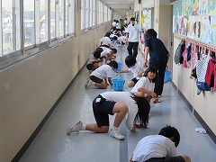 4年生以上で、廊下の汚れを一生懸命取りました。