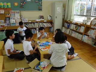 鳳至小学校の図書室では、毎日昼休みに支援員の先生が子どもたちと一緒に折り紙をしてくれています。支援員の先生とおりがみがしたくて子どもたちが集まってきています。