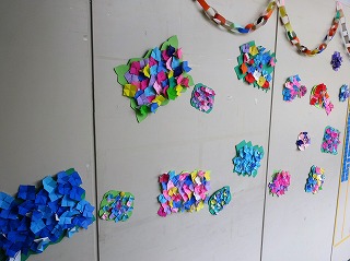 6月に作ったあじさいが図書室の廊下に飾られています。