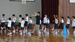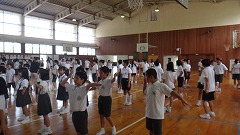 低学年と高学年が体育館で踊りの基本を練習しました。