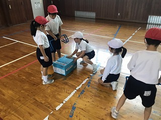 今日は障害物リレーの、「障害物」を工夫して並べました。