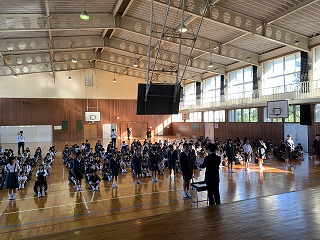 おめでとうの気持ちを恥ずかしそうに伝える6年生。先生も少し恥ずかしそうで、とても可愛らしい時間になりました。