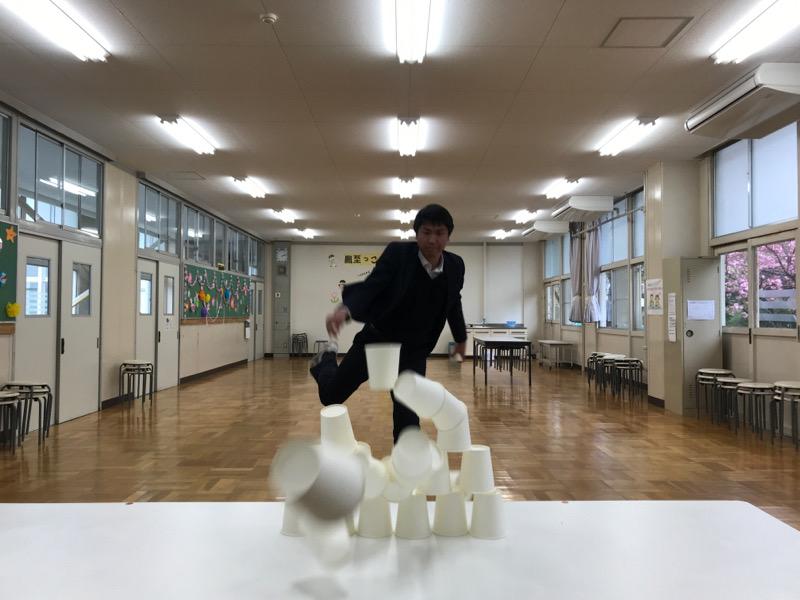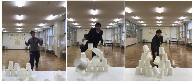1.机の上に、紙コップを並べます。一番下に6こ。その次に5個…一番上に1個のせたら準備完了です!