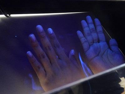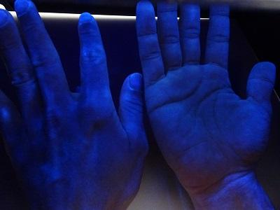 そこで、汚れが青く光る蛍光剤を手に塗って、どこに洗い残しがあるか調べました。