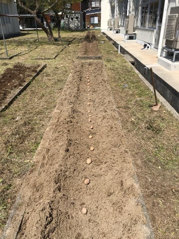 じゃがいもの種イモを6年教室横の花壇に植えました。