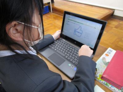 自分のお気に入りを、分かりやすく伝えるために、メモしたことを、もとにして、順番立てて文章を書きまとめていました。また、書きまとめ終えた子は、Chromebookを用いて、漢字の書き取り問題に取り組んで、言葉の力を高めようとしていました。