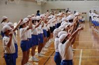 6校の児童が集まって初めての行事である運動会が明後日開かれるため、本日、体育館で予行が行われました。