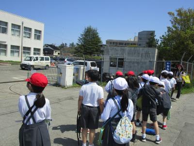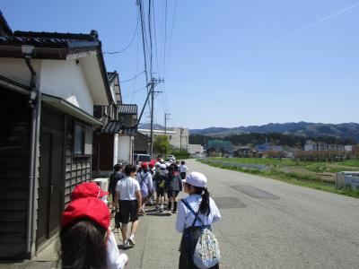 初めての社会科の学習は、輪島市の様子について調べています。この日はお天気も良く、学校の周りを探検しながら、建物などを地図に書き込んでいきました。道の整備はだいぶ整ってきていますが、交通には十分に気を付けて行ってきました。「市役所や!」「ここ来たことある!」など、元気な声が青空に響き渡っていました。