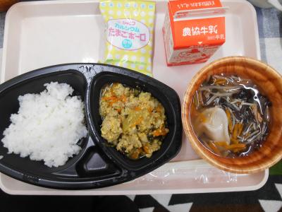 ごはん,高野豆腐のそぼろ煮,ひじきと切干のツナ和え,牛乳