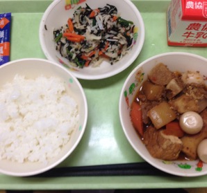 肉みそおでんは食缶を開けるなり、「おいしそう!いい匂いするー!」と言っている子もいて、赤味噌がごはんに合って人気でした。