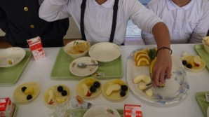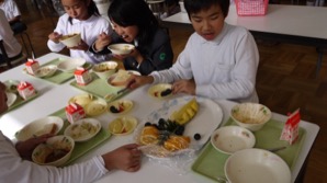そして、今回のランチルーム給食では各テーブルに大皿ににフルーツの盛り合わせを出し、フルーツバイキングをしました(^○^)