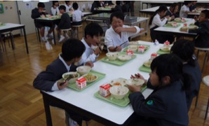 他の学年と向かい合って少しおしゃべりを楽しみながらの給食も