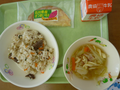 ビーフライス、マカロニスープ、さつまいもクレープです。