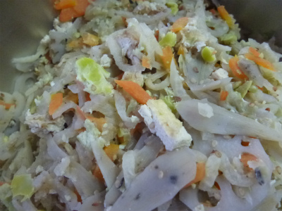 添えの「あいまぜ」も輪島の郷土料理です。大根と青大豆をたたいてつぶした「打ち豆」が入っているのが特徴です。他にもたくさんの野菜や油揚げなどが入っていて栄養満点です!