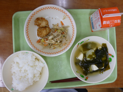 ごはん、輪島ふぐの米粉揚げ、あいまぜ風、わかめのみそ汁、牛乳です。