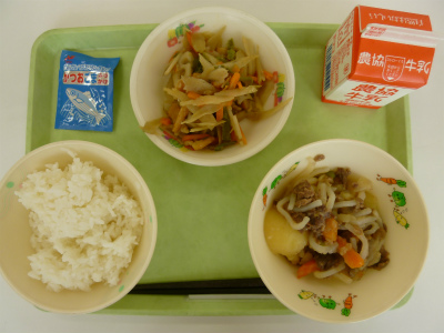 ごはん、肉じゃが、五目きんぴら、ふりかけ、牛乳です。