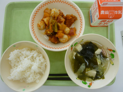 ごはん、酢豚、中華スープ、牛乳です。