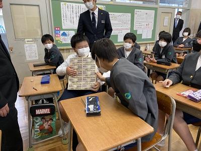 輪島市役所税務課の方による租税教室が開かれました。「もし税金がなければ、私たちの毎日の生活がどのようになるのか」について具体的に知ることで、税金はなぜ必要なのか、どのように使われているのかよく理解できました。また、思った以上に重かった重さ約10㎏の1億円のレプリカを手にして、とてもテンションが上がりました!!