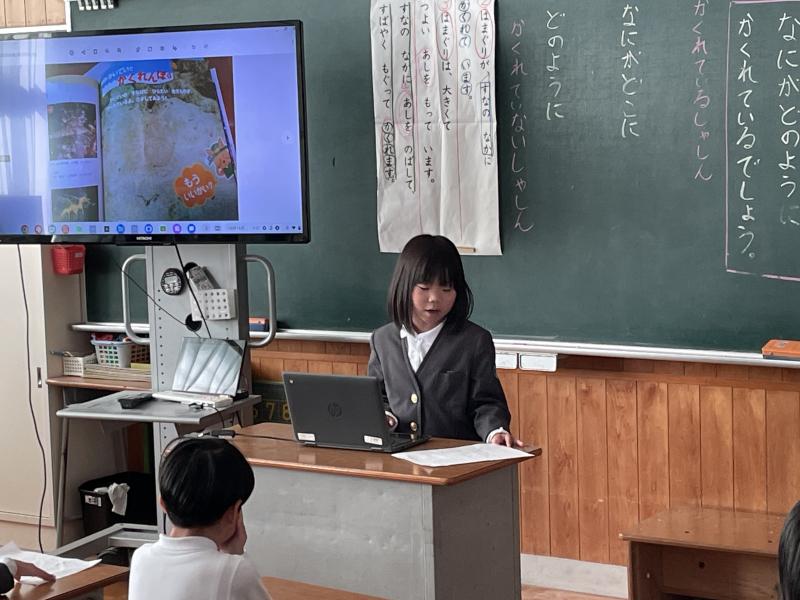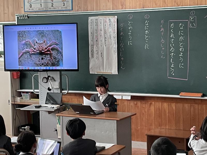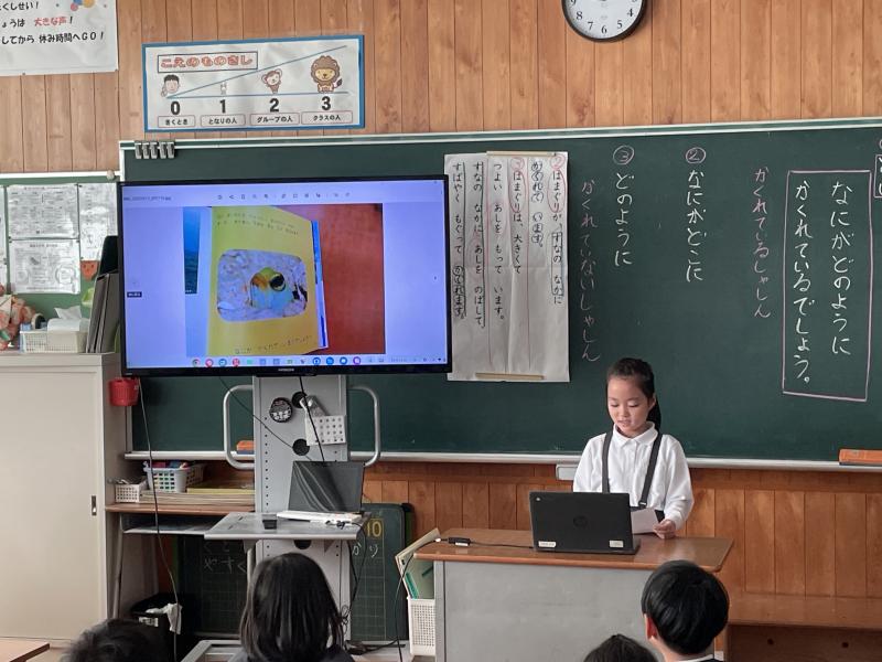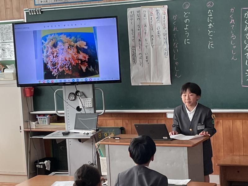 1年生の国語科で、「うみのかくれんぼ」という学習を行いました。この時間の最後には「自分のお気に入りの生き物を紹介しよう!」というゴールで行いました。写真をテレビに映しながらの説明でしたが、子どもたちはとても上手に紹介をすることができました。
