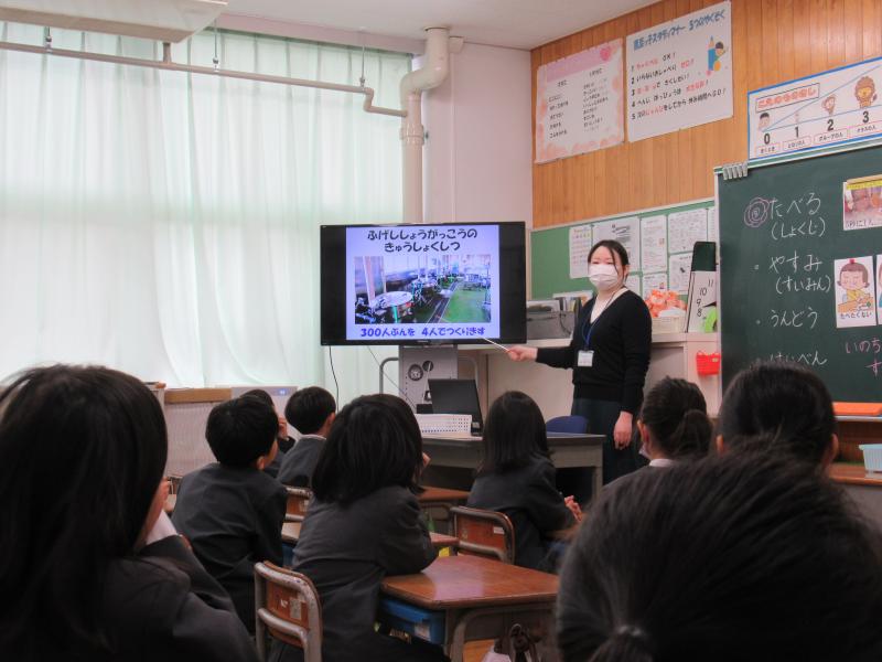 給食の献立を考えてくれている栄養士の先生から、「何を考えながらメニューを決めるのか?」「給食はどのようにして作られるのか?」など、映像を交えてお話をして頂きました。それらのお話を聞いて、改めて子どもたちは、どのような気持ちで給食を食べていくのかを考えることができたのではないかと思います。