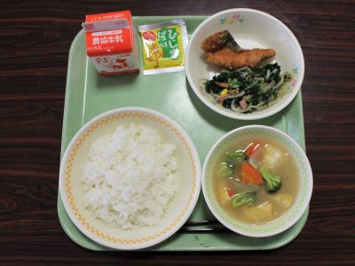 24日(月)学校が再開しました。校内に、子どもの元気な声が聞こえます。さて、今年の全国給食週間(1月24日から1月30日)にあわせて、本校でも24日(月)から28日(金)まで、給食週間の取組を行います。取組内容は ⓵美化・給食委員会のお知らせビデオの視聴(全校) ②調理員さんへの感謝の手紙(1・2・3年) ③給食川柳づくり(4.5年生) ④献立作り(6年生)です。④において、優秀な献立として2名の児童が考案した献立が選ばれ、そのうちの一つが本日の給食の献立に採用されました。テーマは「皆が笑顔になれる給食」、献立名は「さけの竜田揚げ・ほうれん草ともやしののりずあえ・まる芋の味噌汁・ふりかけ」です。考える人や作る人の思いが込められた給食に感謝し、美味しくいただきました。