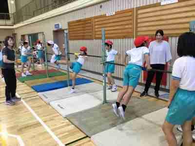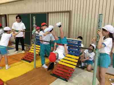 鉄棒週間が始まりました。体育や休み時間に練習します。この日は合同体育で、5年生が2年生に逆上がりや前回りなどをするときのコツを教えました。みんなとっても集中して練習できましたね。