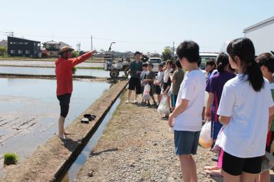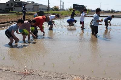5月11日(木)5,6時間目に、5年生が「岡元農場」さんのご協力を得て田植え体験をしました。まずは、社長の岡元豊さん(本校CS委員)と笑顔で英語で挨拶を交わし、手植えの説明を受けました。その後、一人一人「ひゃくまん穀」の苗を持っていざ田んぼへ!泥の感触に大きな声があちこちで飛び交い、田んぼは大にぎわい。足をとられながらも徐々に植え方のコツをつかみ、「お代わり!」の元気な声も聞かれました。お天気にも恵まれ、心に残る農業体験となりました。みんなで一生懸命植えた稲の生長が楽しみです。岡元農場・JA根上・CS委員の皆さん、ありがとうございました。