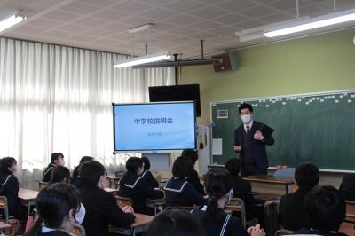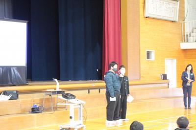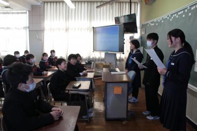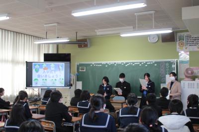 2月9日(金)には、6年生教室で、根上中学校生徒会の3名の生徒さんと2名の先生による学校紹介が行われました。6年生は先輩や先生が説明してくださる学習や生活・部活動のことなどに興味深く耳を傾け、質問もたくさんしました。質問に丁寧に答えながらいきいきと語る先輩方の姿がとても素敵で、中学校生活への希望や憧れをより強くしたようです。中学校進学に向けての自覚を持ち、しっかり準備をしましょう。根上中学校生徒会の皆さん、ありがとうございました。