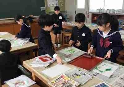 3年:紙版画。いろんな色で何回も刷って作品を仕上げます。