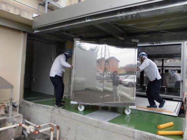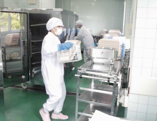 11:50 配膳員さんが各クラスの配膳車に食器やおかずをのせていきます。
