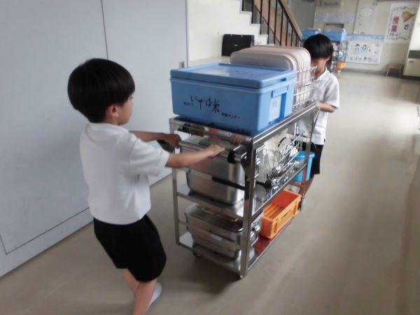 12:10 配膳車係さんが落ち着いて配膳車を教室まで運びます。