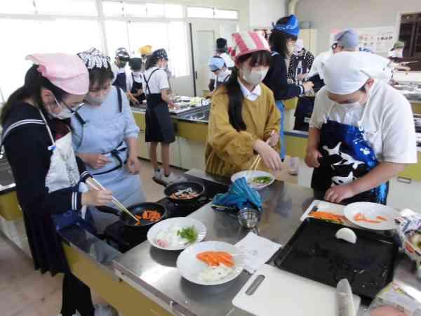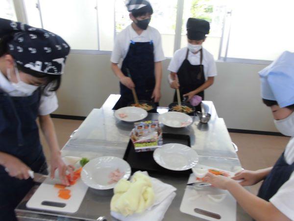 今日のメニューは「野菜の彩炒め」です。野菜に火が通るように切り方や炒める順番を考えながら調理します。どの班もとってもおいしくできました!