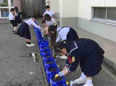 1年:「はやく大きくなあれ。」朝顔にお水をたっぷりあげます。