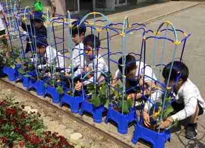 2年:野菜が大きくなったので支柱を立てました。もう、花が咲いている野菜もあります!