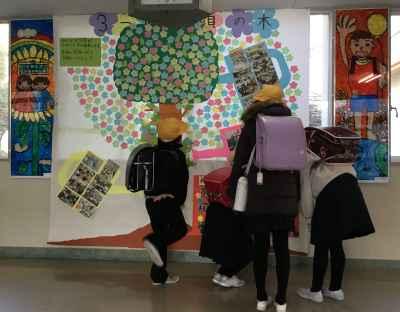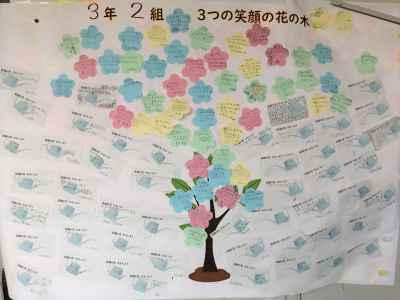 人権集会をうけて、児童会目標の「できた笑顔・いっしょに笑顔・ありがとうの笑顔」の3つの笑顔を増やすために自分に何ができるか考えじょうろに書きました。「じぶんから挨拶をする」「はんのうを返す」「男女関係なく遊ぶ」「ありがとうを伝える」・・・笑顔になるための栄養をたくさんもらった『3つの笑顔の木』は、各クラスでそして学校中に大きな笑顔の花を咲かせました!みんなで、この「3つの笑顔の木」を大切に育てていきたいです。