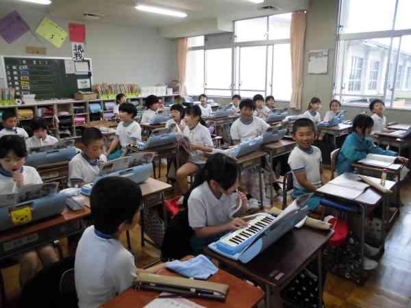 4年:鍵盤ハーモニカに合わせて歌います。みんなとっても元気です。
