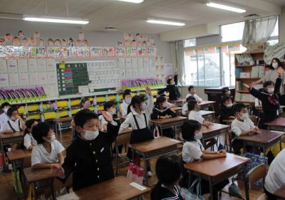 10月13日(水)、1年生が、サラさん(ALT)と外国語活動「アルファベットとなかよし」を行い、ジェスチャーをつけながらアルファベットに慣れ親しみました。身の回りにあるアルファベットを見つけてみましょうね。