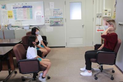 また、休み時間には「サラさんと英語で話そう」に参加する児童が、校長室に集まりました。サラさんに、「得意なことは?」「好きなおやつは?」などの質問をして、会話を楽しみました。英語がわからないときは、サラさんが教えてくれますよ。また次回が楽しみです。